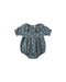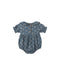 A sweet romper with a collar, short puff sleeves, and ruffle details, finished with back buttons and bottom snaps for easy changing.