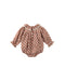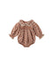 Our Callie Romper features a sweet collar with crochet trim, smocked front, and gathered long sleeves. Buttons at the back and snaps at the bottom make for easy dressing.