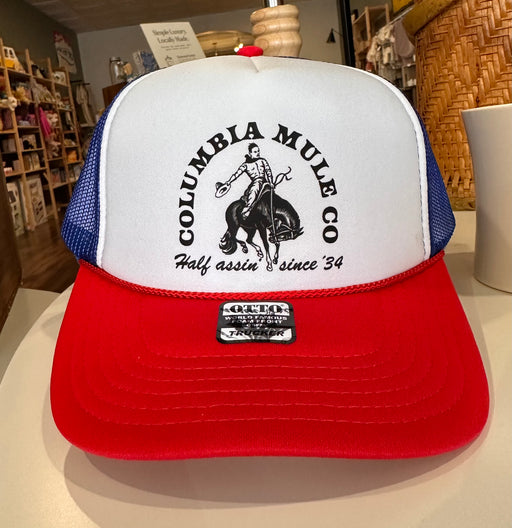 Needle & Grain ProvisionsOtto mid crown trucker cap with Columbia Mule Co, a buckin' mule and "half assin' since 1934 (the first Mule Day). Designed and printed in-store. M...