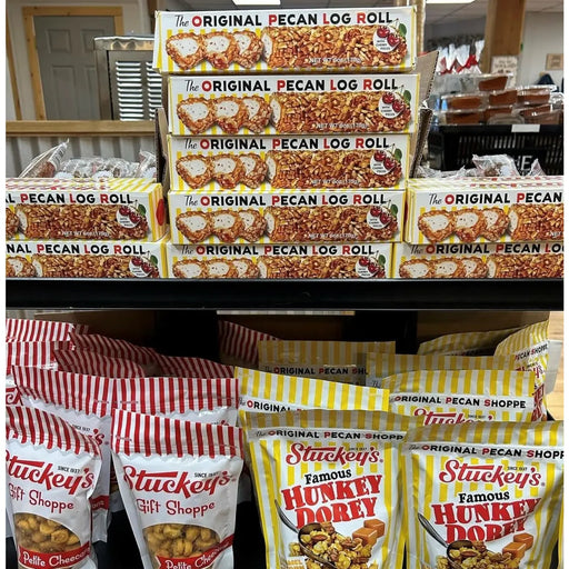 Stuckey's signature Pecan Log Roll Candy is a Southern staple made with fluffy vanilla nougat, drenched in rich caramel, decadent chopped cherry pi...
